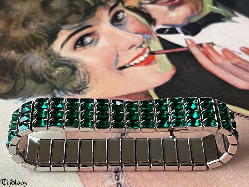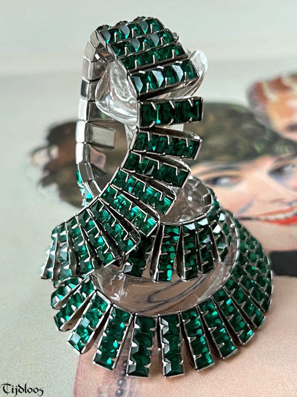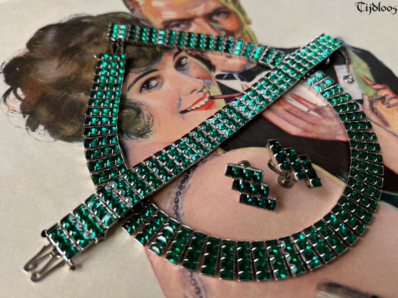 This dazzling parure set with sparkling green rhinestones will make you feel like a movie star. The simplest outfit will look amazing once you slip this set on. Imagine how it will sparkle and shine at a candlelight dinner, an evening at the theater, or a night out with friends, I can assure you, heads will turn. Of course it falls under the category ‘Costume Jewelry’, if these were real emeralds, this set would cost you a small fortune, and you probably wouldn't dare to wear it on a night out either.
