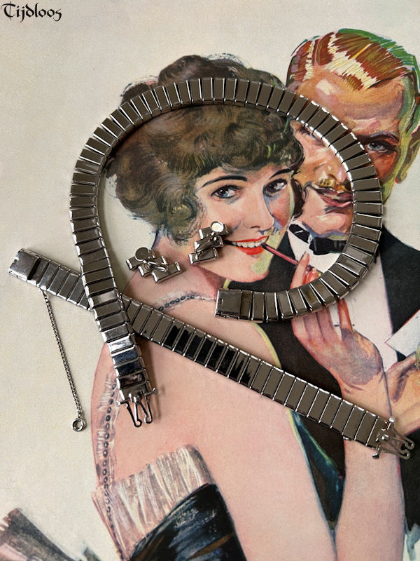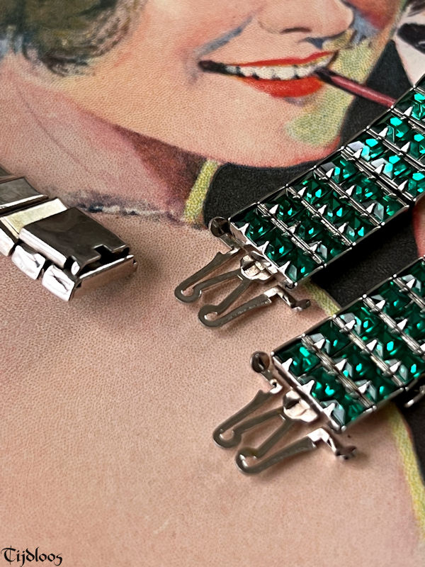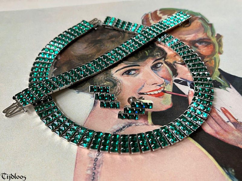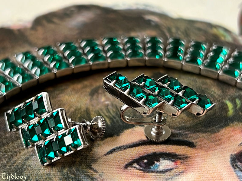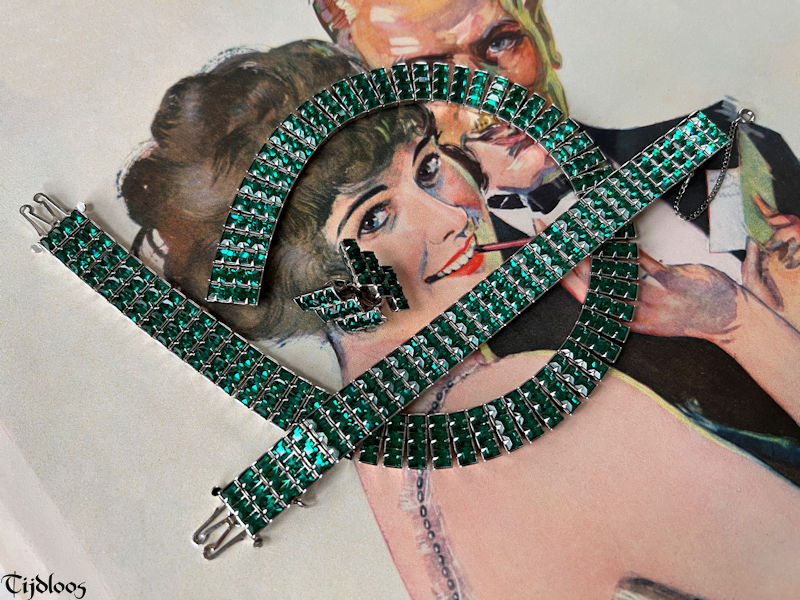Although the set is unsigned, it undoubtedly originated from the US. The square green rhinestones are channel set. The set is Rhodium plated, and the hidden push-in clasp closures on the necklace and bracelet work perfectly, the bracelet even has a safety chain in place, and the spring closure jumps tightly open en close.