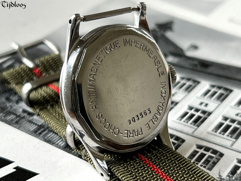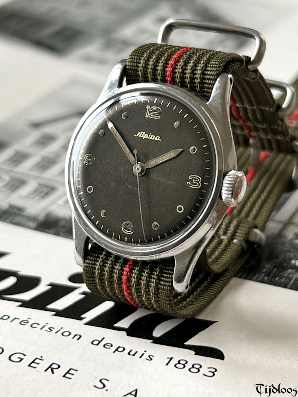 This mid-1950’s Alpina is 32 mm in diameter excluding the crown and the lugs. The stainless-steel case has seen some action, but the markings are insignificant. The freshly serviced 17 jewel Alpina caliber 588 manual wind movement looks remarkable and is working well.