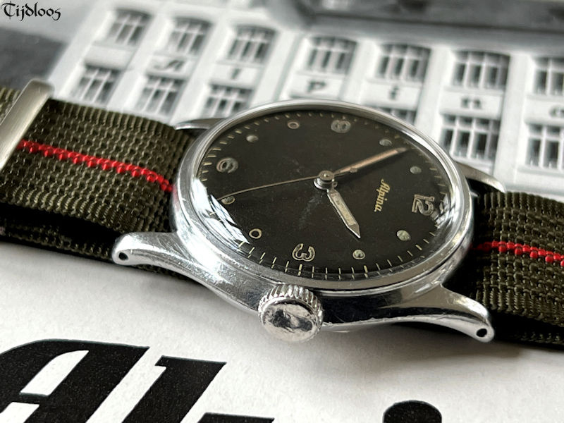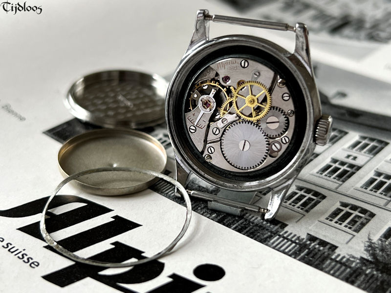 The movement is kept safe from dust and whatnot by the dust cover, which is placed over the movement and sits tightly between the movement and the case back. The case back is screwed on, and held extra shut and secure with the original lead gasket. The black dial with Arabic numerals is original, and looking well, it is not a pitch-black color, but slightly lighter.