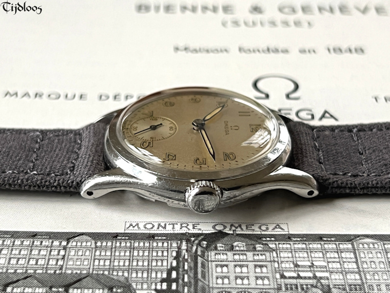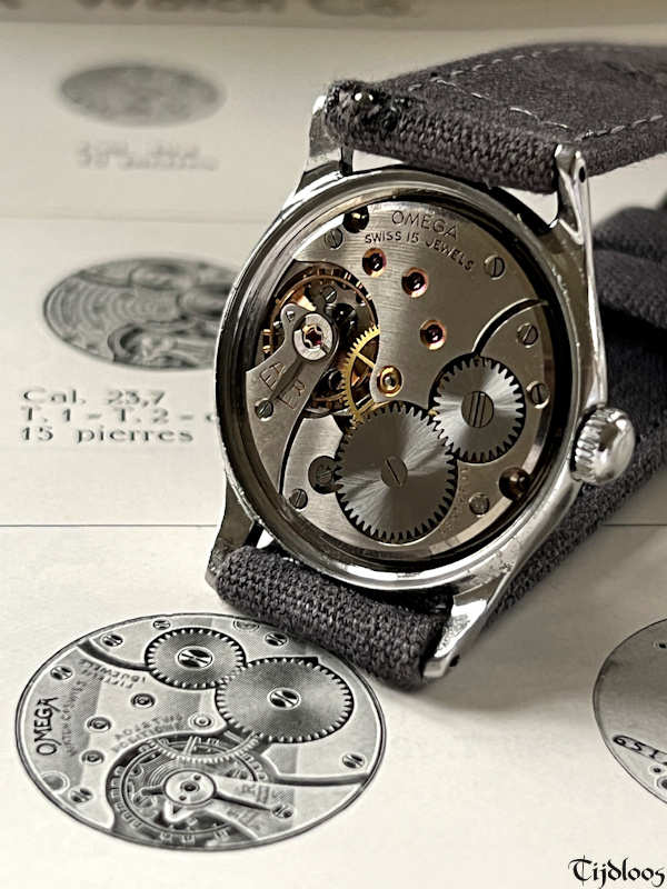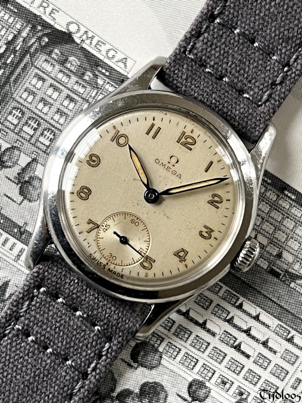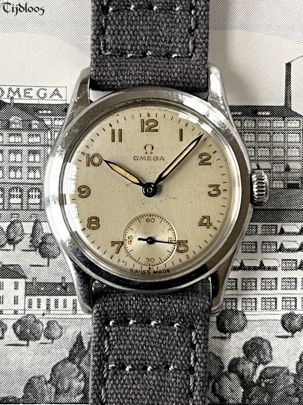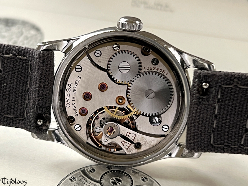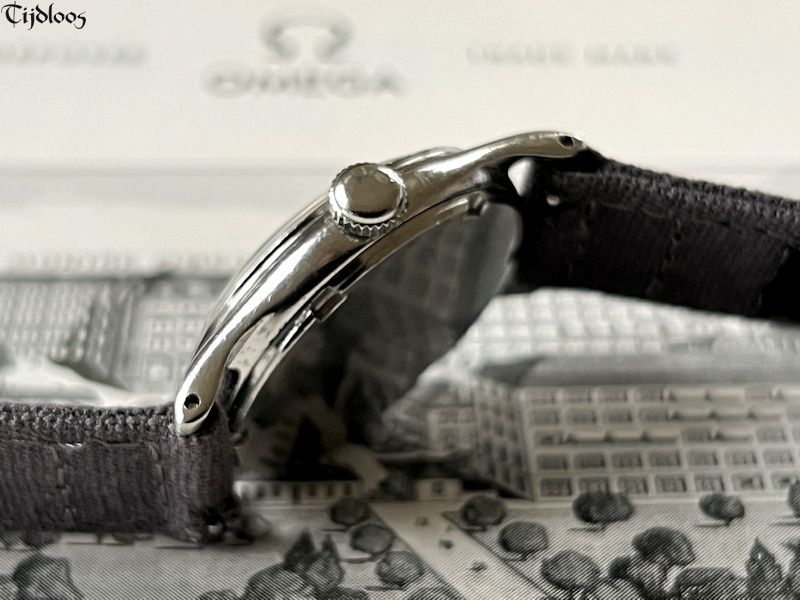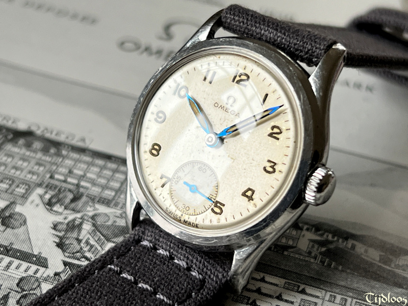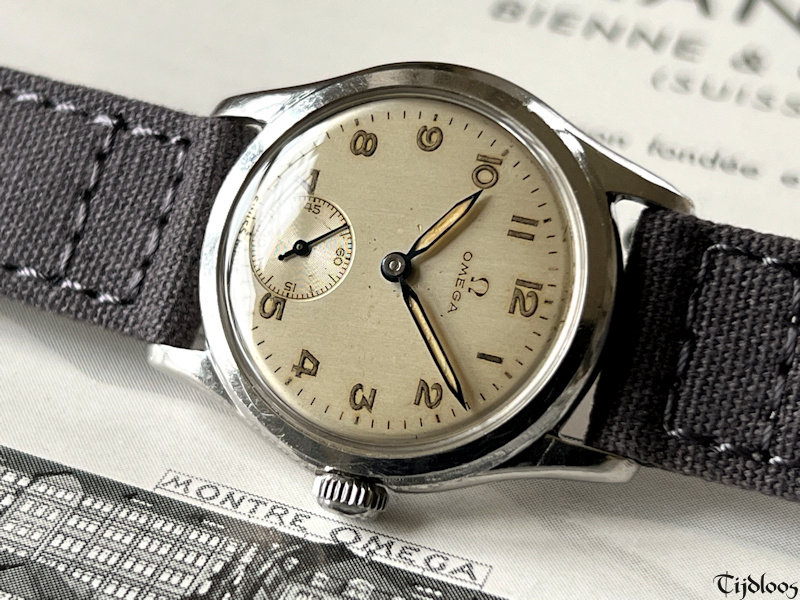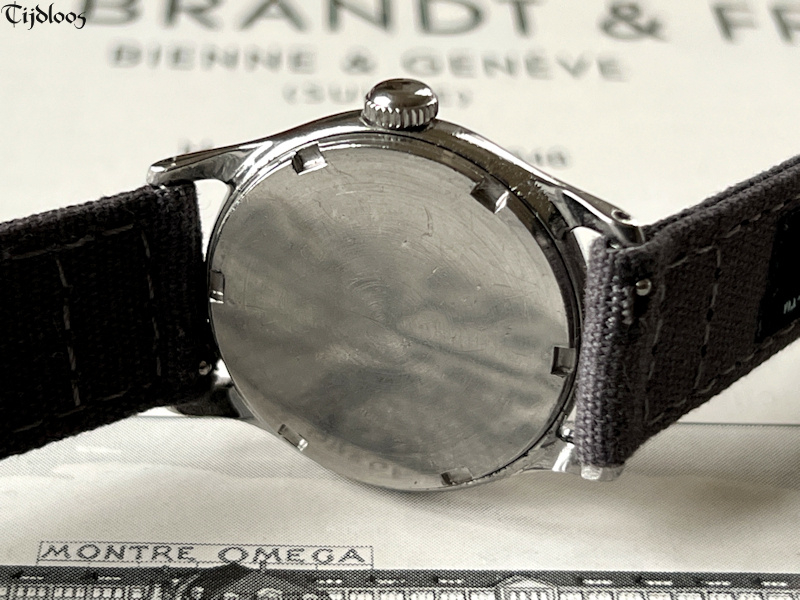 This stainless-steel Omega watch dates from the 1940’s. The case and crown are untouched and carry signs of wear, nothing worth mentioning though, just signs you would expect to find on an 80 plus year old watch. The case back is a screw-down with ‘sei tacche’, oops, that nickname was only invented for Longines, because no other brand uses ‘six notches’ ?¿