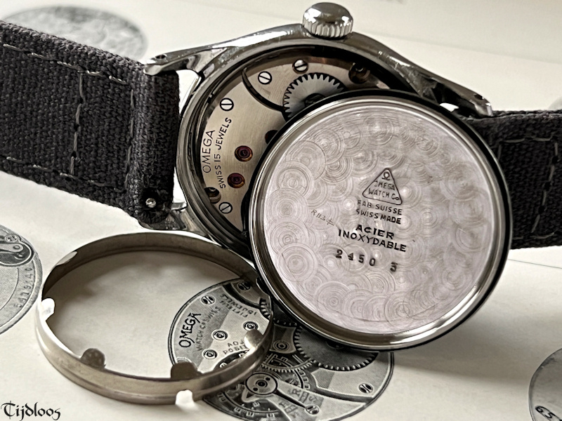 The case reference is 2450-3. Inside you will find the freshly serviced superb, robust and reliable in-house manual wind Swiss Omega 26.5T3 caliber with a sub-second function. It is ticking way the time, as if not a year has passed. Around the movement and between the case back sits an extra case-ring with 8 flaps, it is used to absorb shocks and protect the movement.