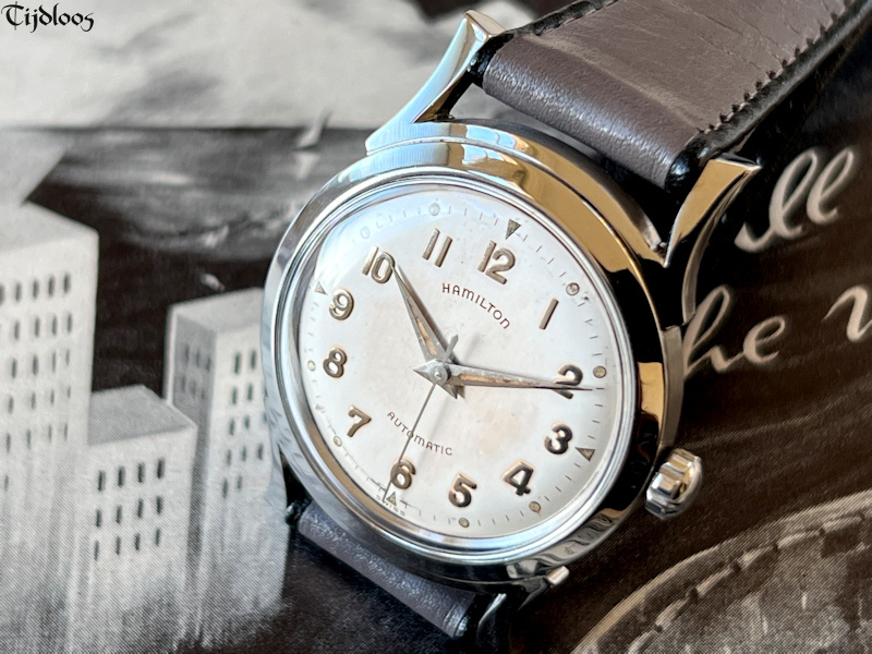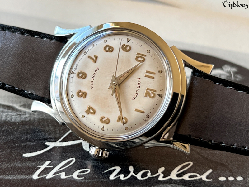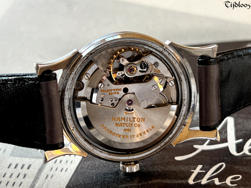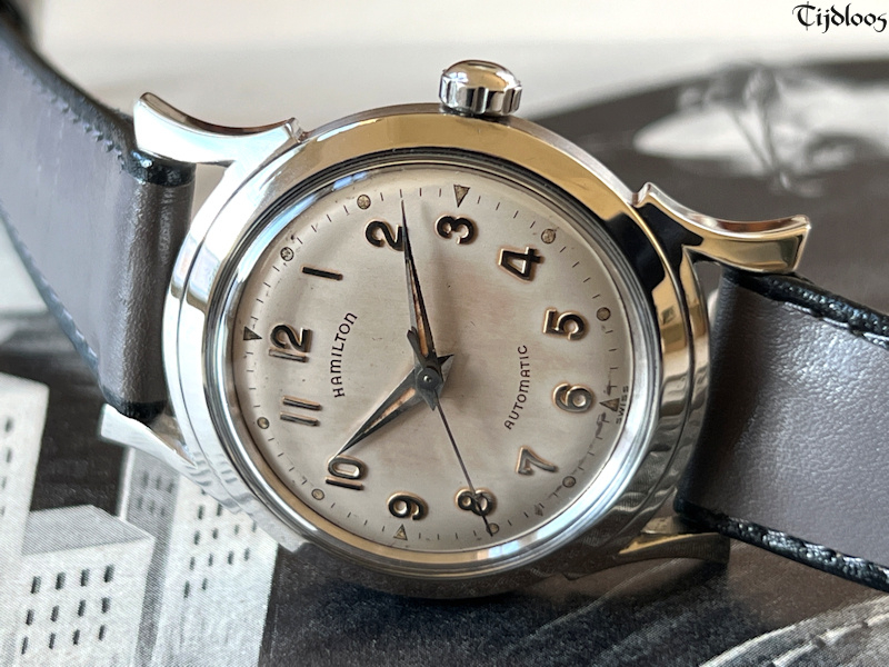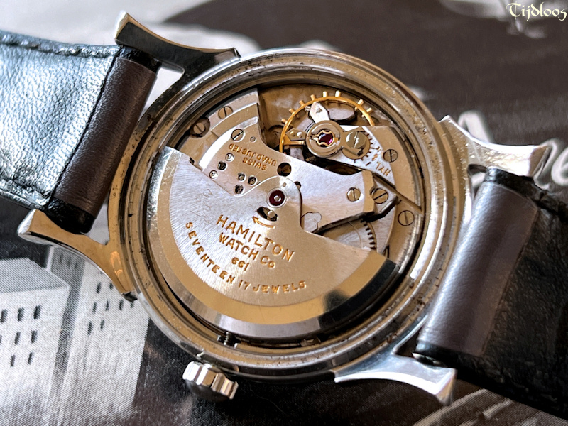 This Hamilton has just the most spectacular case, check out the curve on those lugs, I bet you've never seen lugs like this. The case is glossy except for the sides of the case. The back is screwed down, and reads Hamilton, Anti-Magnetic, Shock-Resistant, Water-Resistant and Stainless Steel. Though Hamilton produced their own in-house movements they did make exceptions. This high quality, reliable Swiss automatic wind movement with sweep second function caliber 661 is based on the Swiss Certina caliber 25 movement. The Swiss Hamilton 661 caliber was in use from 1951-1960. Every detail on this watch is original, only the strap is added, though it is unused and vintage. The photo’s do not do the Hamilton justice, it looks absolutely stunning in real life...