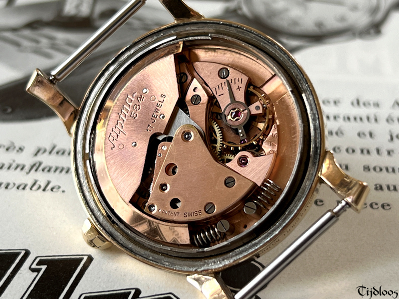 We have a large, stunning warm gold 1950’s Alpina Bumper Automatic is store for you. The case is rolled in gold up to a thick 40-micron layer, it’s almost dripping gold. The bezel is relatively large, matching the beautifully curved lugs. The dial is in a gorgeous two-tone cream color, with a playful aspect, depending on how the dial catches the light, either the outer circle or the inner looks a shade darker or lighter. The indexes are raised and wonderfully faceted. This bold gold watch is completed by the powerhouse inside, which is the Alpina Bumper Automatic inhouse caliber 584, take a look at those huge bumper springs. When you move your wrist, you can actually feel and hear the bumper bashing against the large bumper springs. This rose gold gilded robust patented movement with sweep second was launched in 1945. We added a Khaki Tan shade Nato strap with gold-colored fixings, which complements the watch nicely. All in all, a great looking watch, in a good size...oops, I almost forgot to mention the crown, its dome shaped with 10 faceted sides, an amazing shape, not much grip mind you, but hey...you don't need to wind it, it's an automatic ㋡
