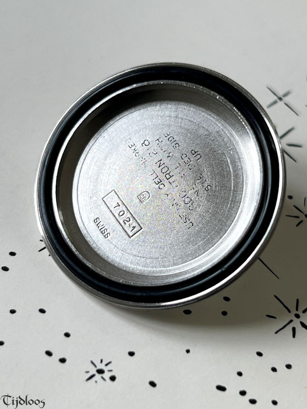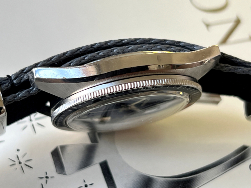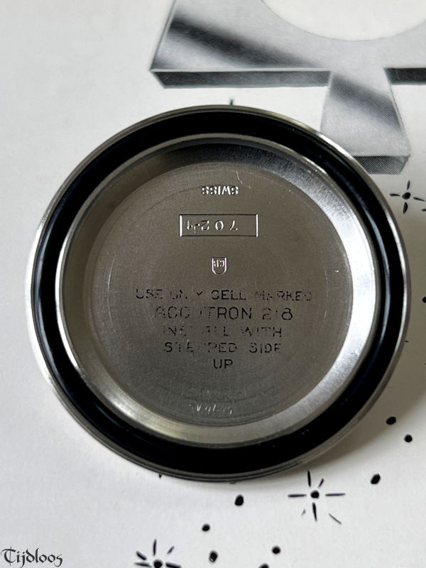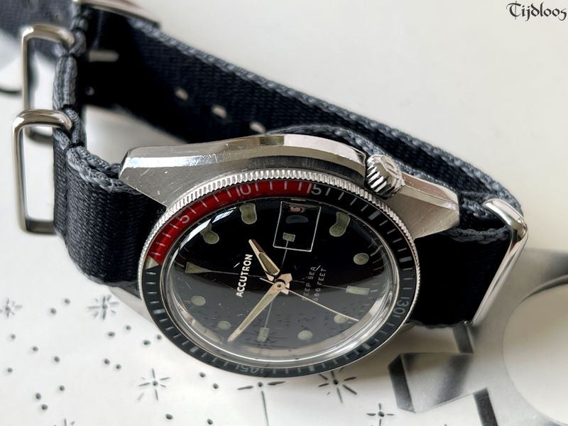 This handsome devil, fulfills all the expectations. Beautiful pitch-black dial, with raised glossy Accutron letters, luminous hour markers and matching dauphine hands. The sturdy, yet sleek stainless-steel case, is topped off with the stunning black and red acrylic bezel. This bezel is unique and a contrast to the common inserted aluminum bezels. The original crown with tuning fork logo is situated at the 4 o’clock, giving it a quirky look. We left the original slightly dome shaped crystal, with an integrated cyclops date magnifier in place, it has a few fleabites here and there, but these are only really noticeable when you enhance the photos.