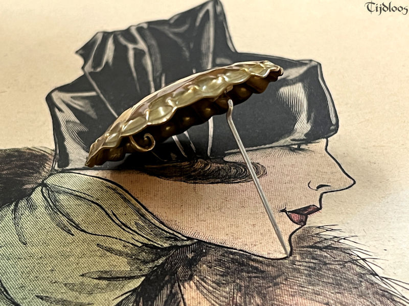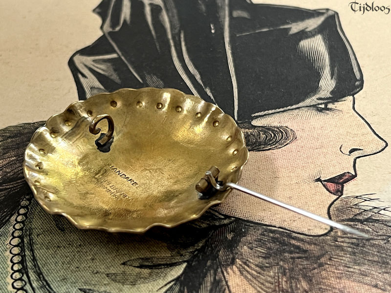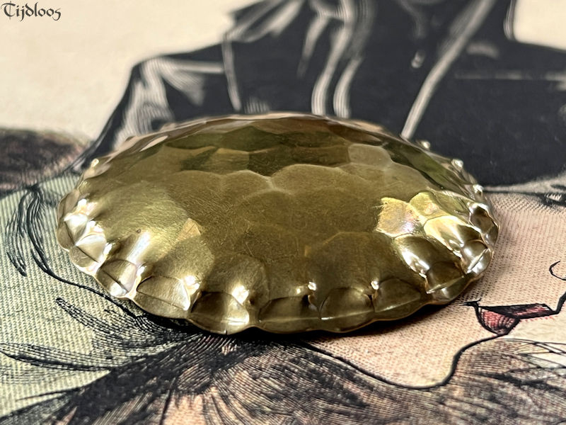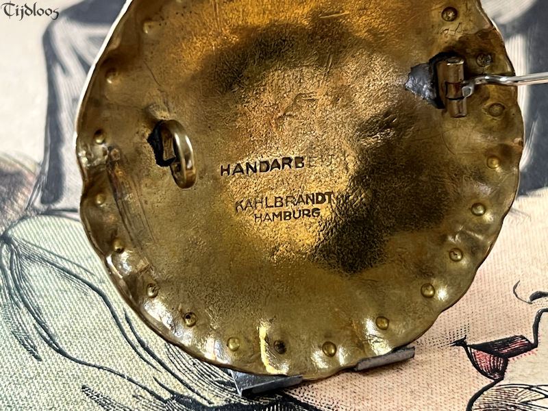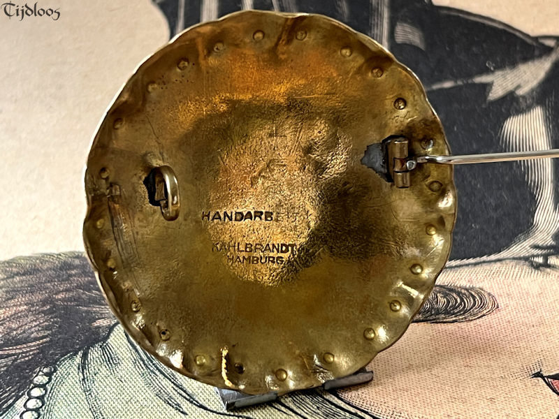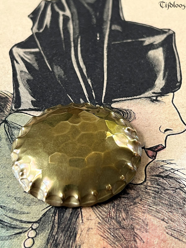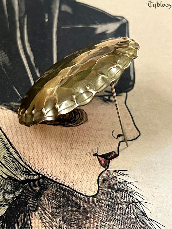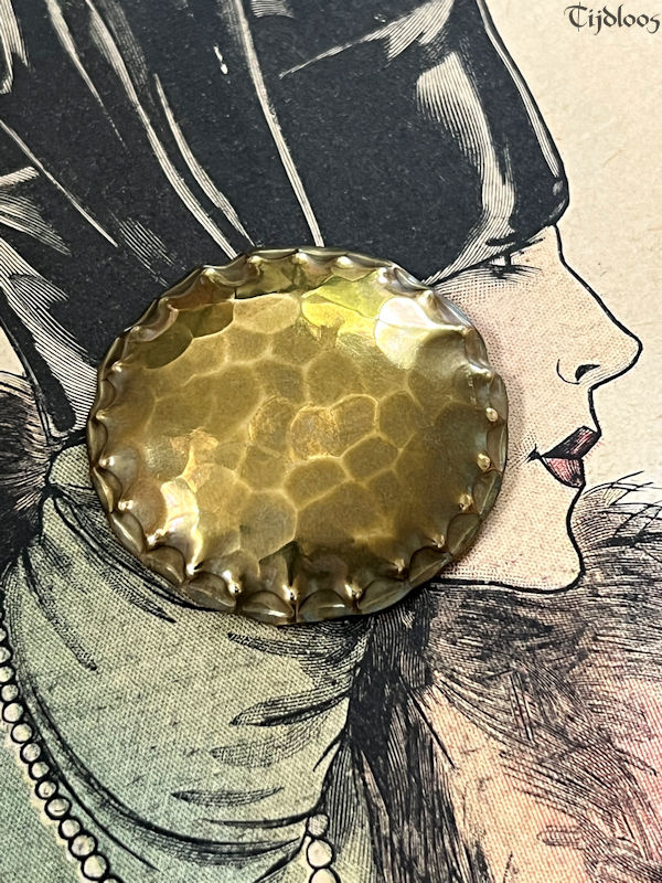 Albert Kahlbrandt (1878-1961) was a goldsmith, engraver, and brass/silver sculptor in the Arts and Crafts period. He was head of his own workshop and he taught his fine craftsmanship at the School of Arts in Hamburg. He even won a gold medal in Paris during the Exhibition in 1937. Brass played an important role in Germany before and during WWI. Though the brass brooch my seem quite simple at first glance, but the more you look, the more you see the wonderful craftsmanship that when into this design. I love the fact that it is all made out of one material, one flat plane circle of brass, which is hammered with precision into a beautiful dome shape, with sculpted edges, it plays with the light and the colors surrounding it. The closure is a simple pin-hook, as you would expect on a brooch of this age. It’s a nice large brooch that will make any outfit look utterly stylish.