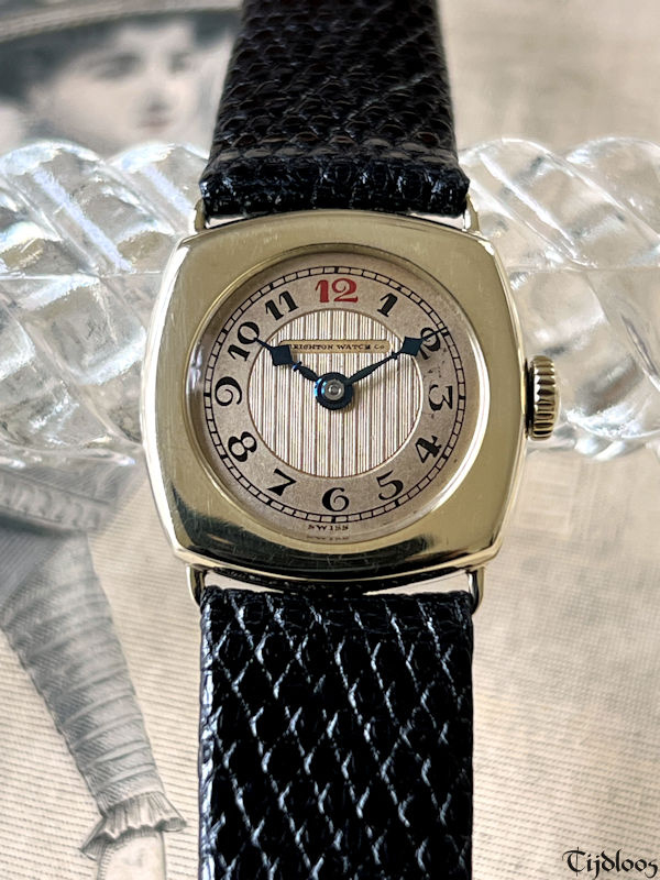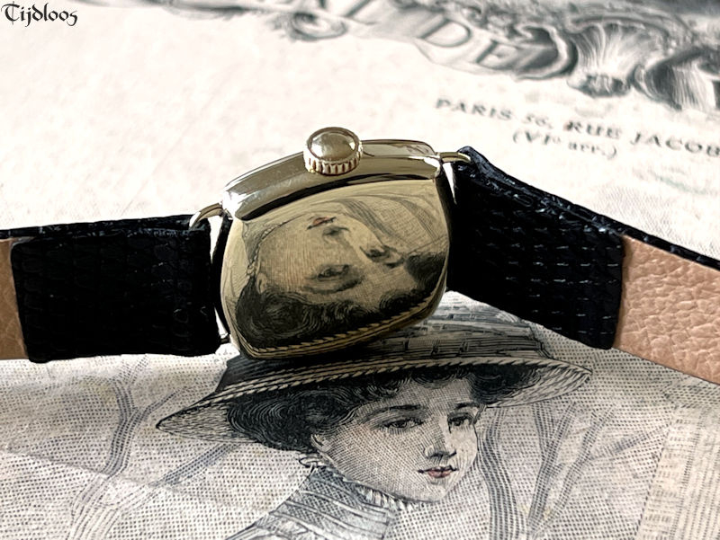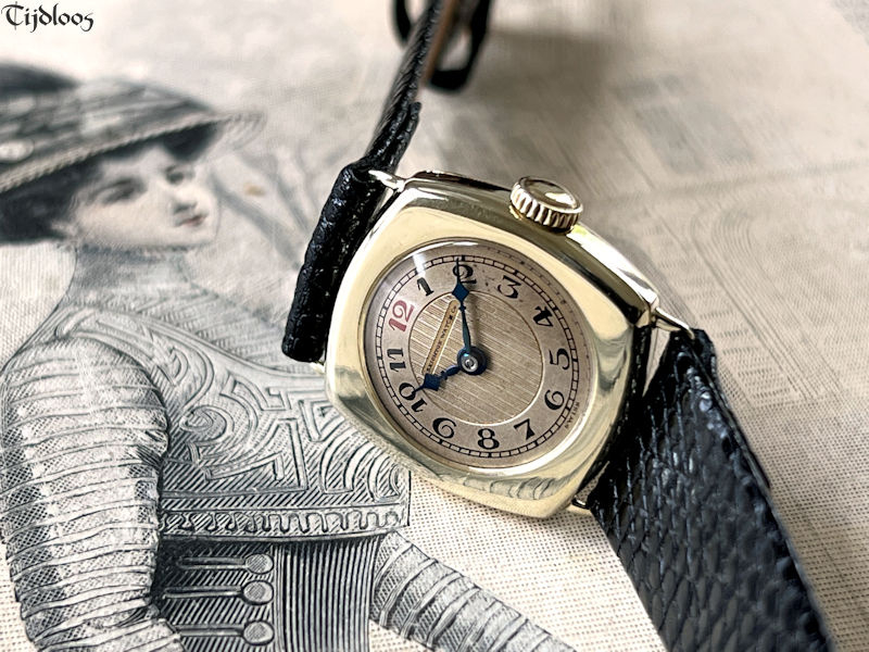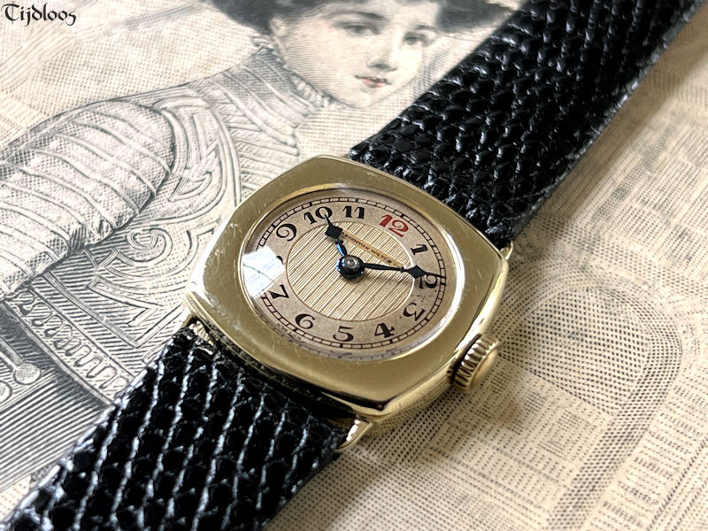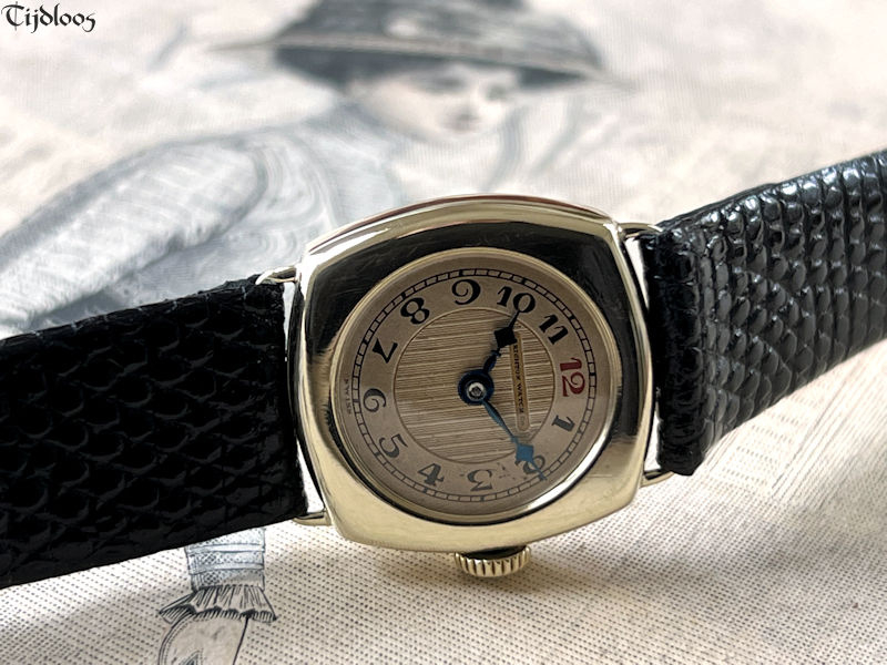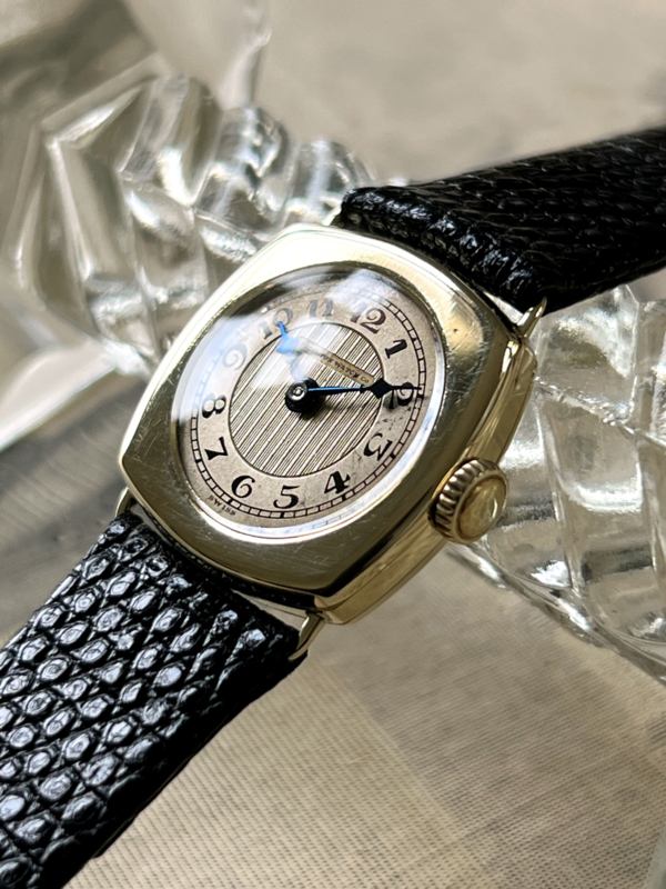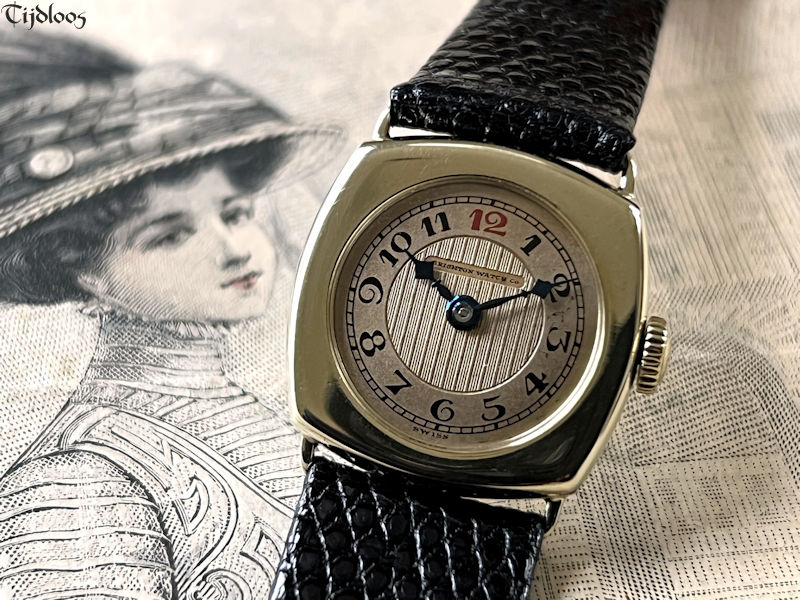 Around 1880 wristwatches, in those days called ‘wristlets’ became fashionable for woman, first they were miniature copies of men’s wristwatches, but later on they became much more decorated, and distinctive. This cushion shape ladies watch dating from approximately 1915 resembles the trench watches used in the WWI. Yet no luminous indexes, or hands, as there is no need to get the time in the dark of night. The 14k solid gold Wadsworth (USA) case is exceptionally well made; it is engraved on the inside of the case back which is rare. Was it a secret gift, a romantic gesture, who knows? The engraving is beautifully done, and as it is done on the inside, it has no bearing on the worth. These types of cases were finished while the case was ensembled, that’s why all parts fit so perfectly together.