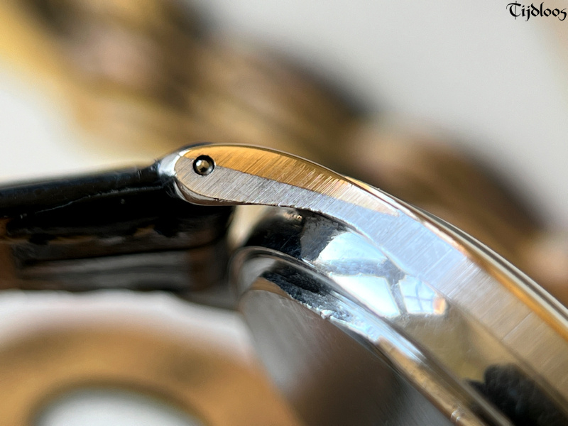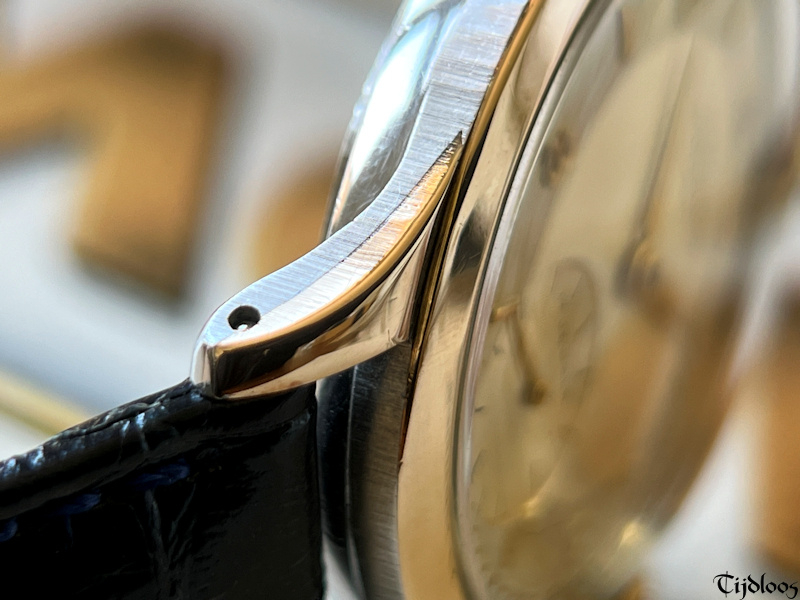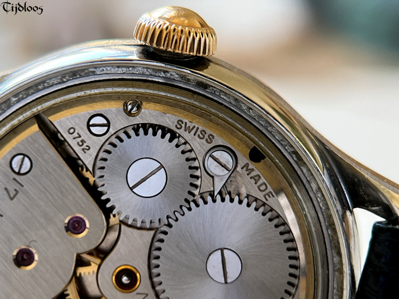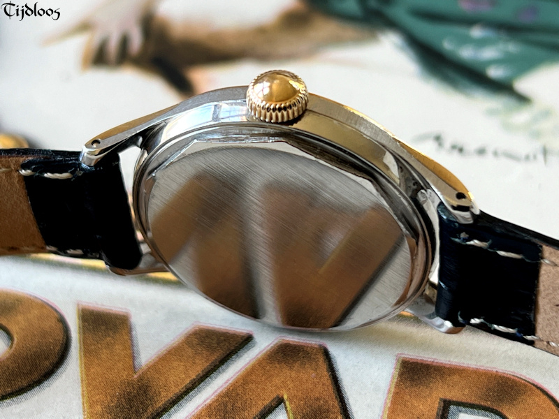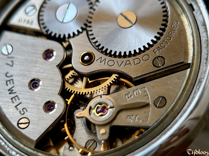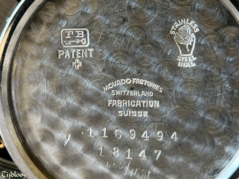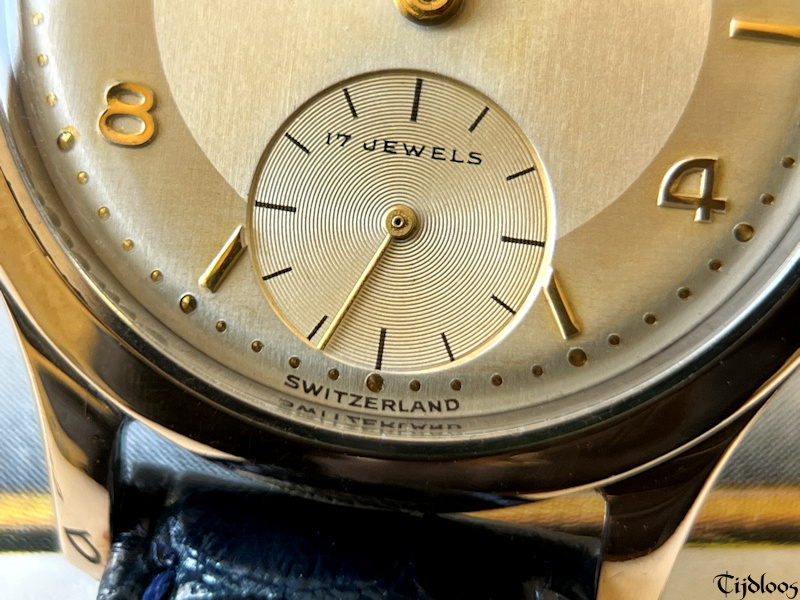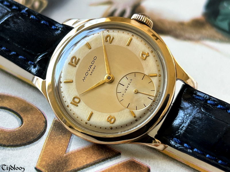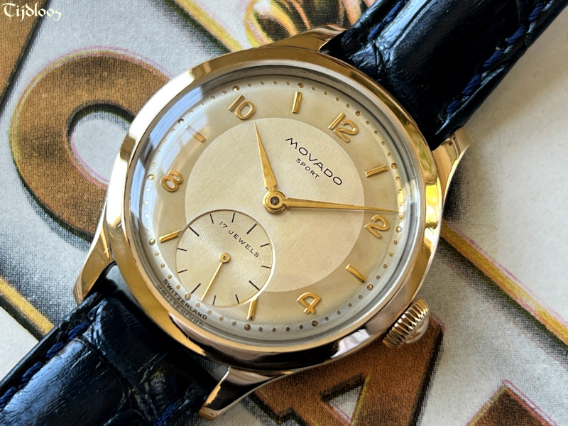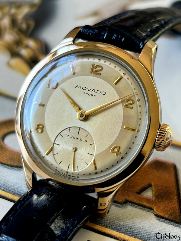 This ‘near mint’ Movado Sport watch is a gem.The Movado watch has an extraordinary case, a ‘Gold Cap’ is usually a thick evenly spread layer, but this gold layer consists of half of the lugs, a layer you will never wear through. Not surprising as it is signed FB - François Borgel case. François Borgel was considered one of the best suppliers of watch cases in Switzerland. You can hardly see the difference while wearing a solid gold, gilded or gold cap watch, but the price will make a difference especially with the current gold fever frenzy.The original crown has a lovely shape, and good grip. The original champagne colored two-tone dial is stunning. It has a striking detail, ‘17 jewels’ is printed onto the sub-second scale, see photo. The Swiss in-house manual wind Movado caliber 125 was launched in 1946, it not only looks amazing, it also offers high quality and reliability. The movement is extra protected by a dust cover. The acryl crystal is slightly domed, clear and unscratched. It has received a full overhaul; it has been cleaned, tuned, adjusted and is keeping good time. Sold with 1 year warranty.